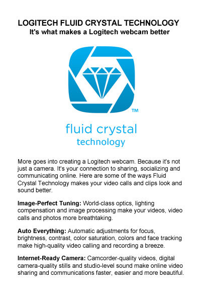 ![]() | ![]() | ![]() | Logitech Fluid Crystal Technology Now it's in every Logitech webcam, giving you: Learn more |